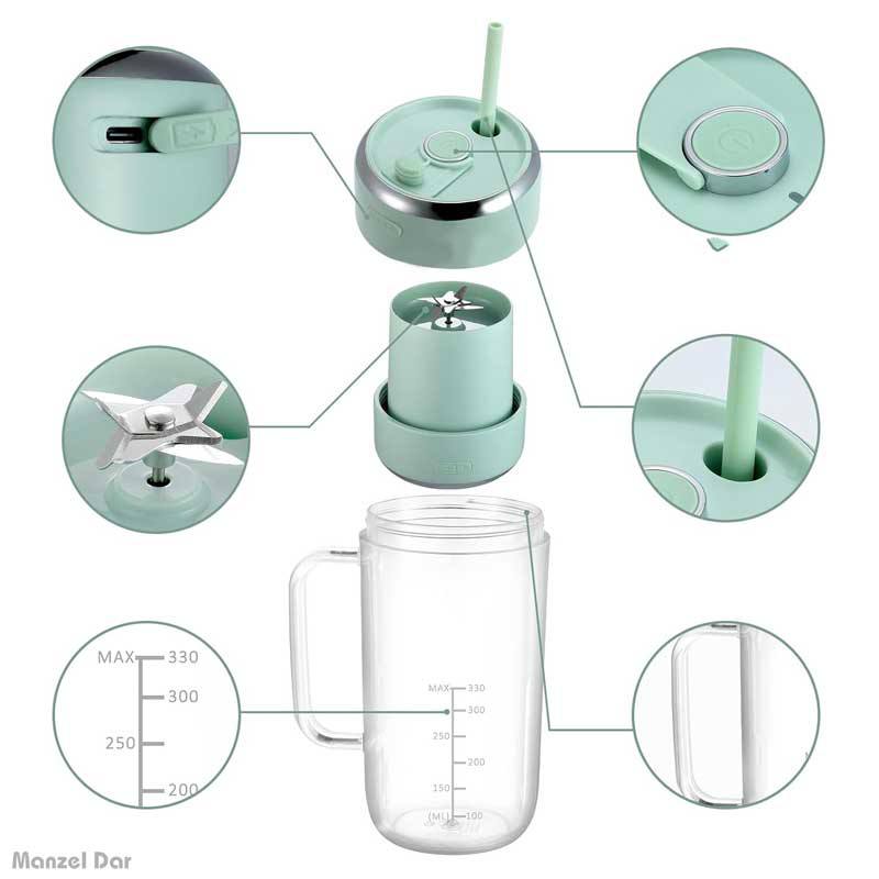 توان مصرفی 60 وات بدنه پلاستیکی تک سرعته تیغه از جنس استیل ضد زنگ باتری با شارژدی بالا مخزن 330 میلی لیتر دارای درگاه تایپ C